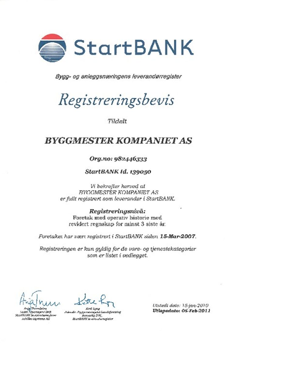 Byggmester Kompaniet er, og har vært full registrert som leverandør i Startbank siden 15 mars 2007.